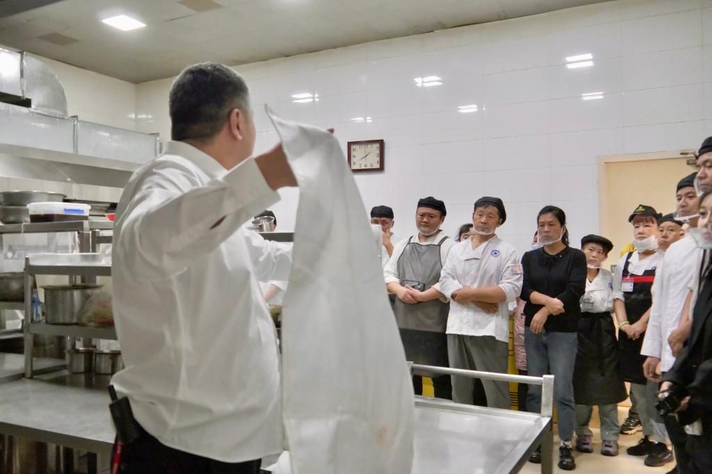 在北区食堂后厨指定演示区域,消防专员以理论讲解结合动作示范的方式,聚焦灭火毯使用教学、模拟油锅起火处置两大核心场景开展现场教学,确保理论与实践紧密结合。
