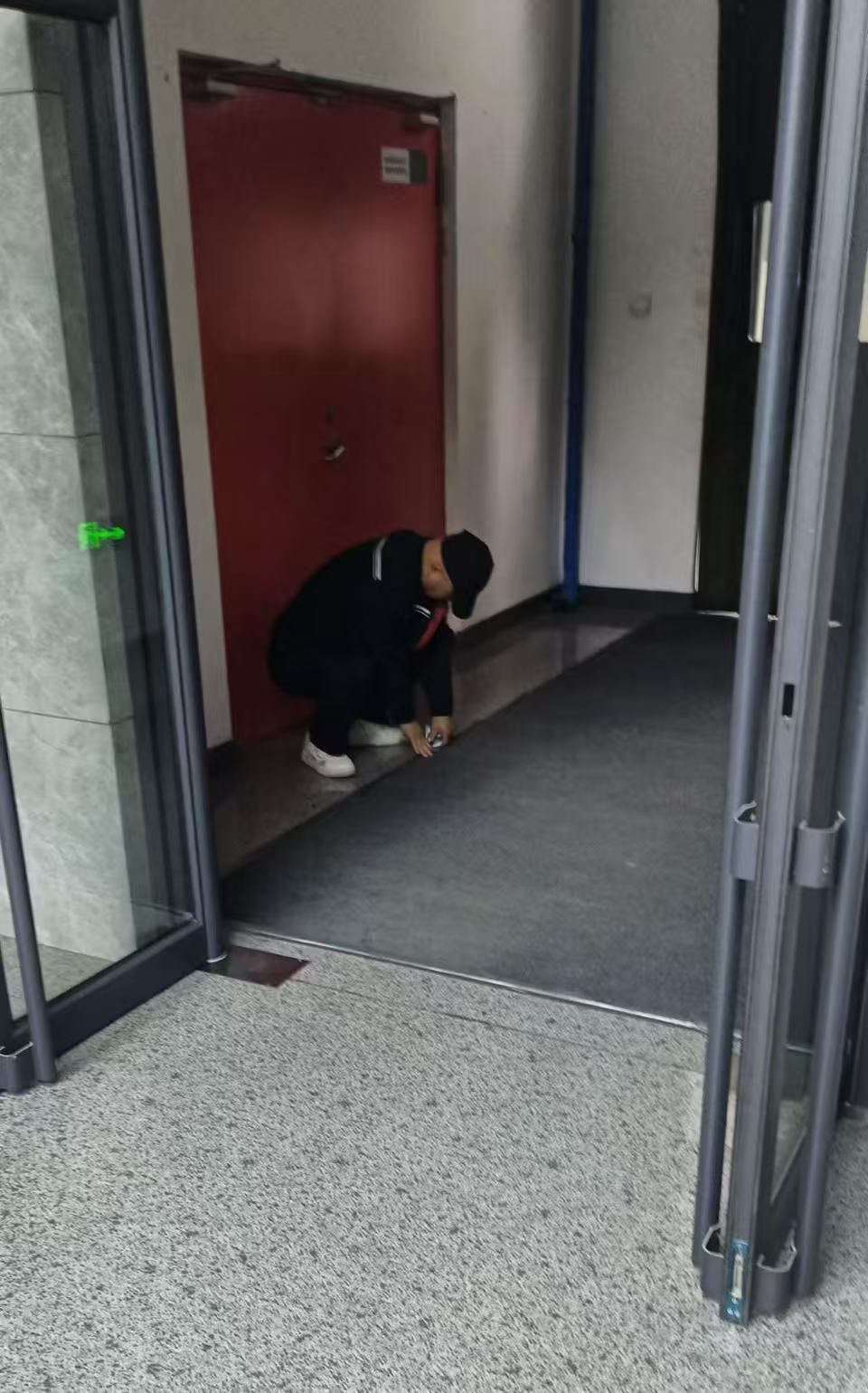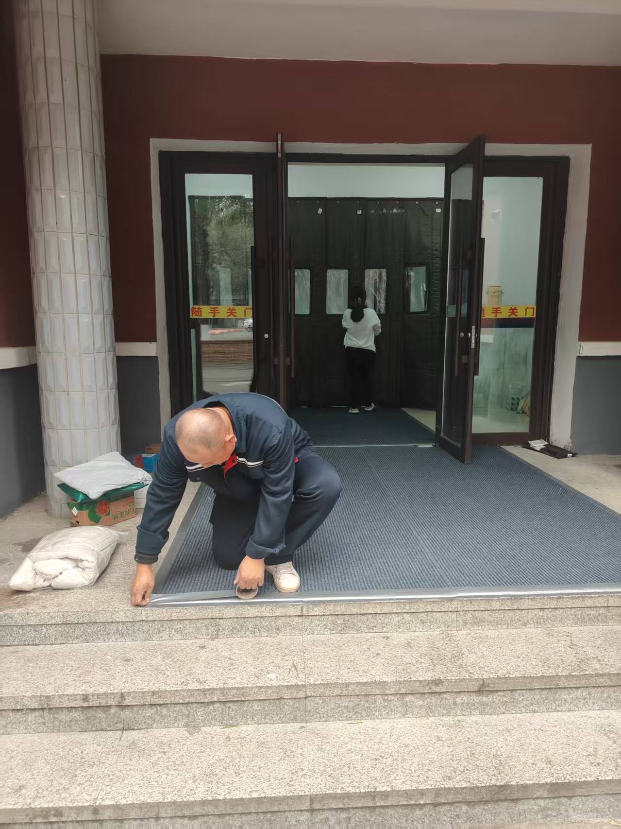 同时,防滑地垫铺设工作同步推进。根据各出入口人流量、空间大小,精准平整铺设耐磨防滑地垫,重点防范雨雪天气地面湿滑带来的安全隐患。每一个环节都细致入微,用娴熟技艺确保防护设施到位见效。